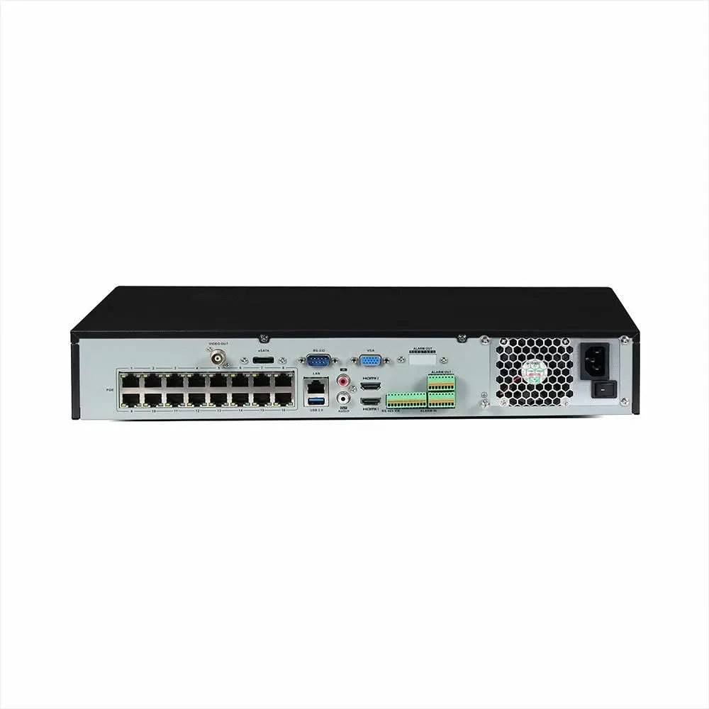 NVR 32 canaux de caméra IP, résolution d'enregistrement jusqu'à 12MP/ch, bande passante d'enregistrement max 256Mbps, HDMI(4K), sortie VGA jusqu'à 1080p (2ème HDMI jusqu'à 1080P), capacité d'affichage local 16-ch@1080Pch (4ch 4K), 4 SATA, 3 USB, 1 x RJ45(10/100/1000), supporte les caméras réseau multi-marques et ONVIF, 16 ports PoE af/at (total max 200W), alimentation 230Vac, Capacités d'analyse intelligente : Filtrage des fausses alarmes pour la détection des comportements sur 4 canaux (franchissement de ligne et intrusion) pour les caméras réseau dont la résolution est inférieure ou égale à 2 MP.( reconnaissance du visage et du périmètre pas en même temps )